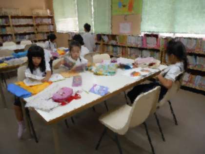 図書の時間です。子どもたちは、本の返却・貸し出しを行い(画像上)、静かに読書を楽しんでいます(画像中)。