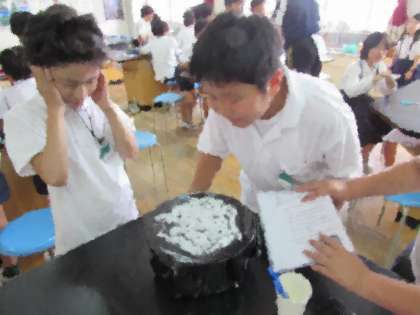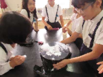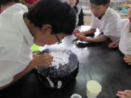 科学クラブの今日のテーマは「音で遊ぼう」です。ぴんと張ったビニールの上に、食塩を広げ、そこに向かって大きな声を出しました。食塩の粒が踊ることで、ビニールが震えていることが実感できました。