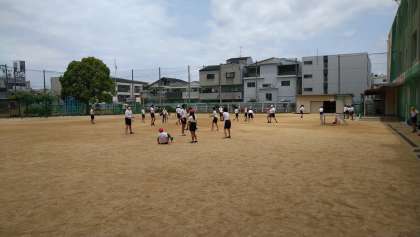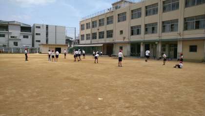 6−1の体育で縄跳びをしました。大繩では4つのグループに分かれていろいろな飛び方をしています。