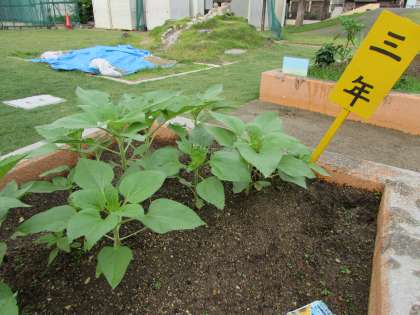 夏至の今日、太陽が高く昇り、学習園では植物たちがすくすくと伸びています。3年生が植えているヒマワリは、本葉を増やし、太陽に向けて大きく手を広げているかのようです。