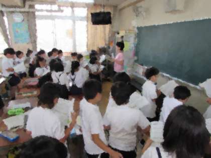 4年2組の学習の様子です。音楽で、皆で歌を歌っています。皆で教室の前の方に集まることで、声の重なり、表情などを、互いに感じ合うことができています。