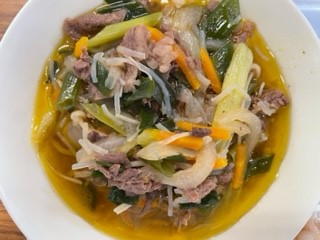 7月13日(水)の献立は、牛どんぶり、きゅうりのしょうが漬け、大福豆の煮物です。ご飯がとっても進みます。