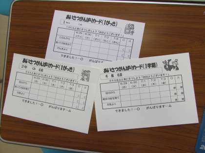 来週一週間、千本小学校では、「あいさつがんばりカード」を使って、あいさつ運動を行います。1年生は10人と、2年生から6年生は20人以上と、「自分から」「相手の目を見て」「元気よく」、「おはようございます」とあいさつすることを目標に取り組みます。お子さんへのご家庭での声かけも、どうぞよろしくお願いいたします。
