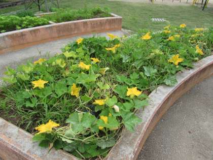 本日の学習園の様子です。5年生の学習園では、勝間南瓜(こつまなんきん)の花が、たくさん咲いています(画像上)。葉の下では、たくさん実が生っています。