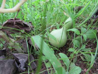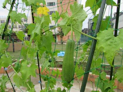4年生の学習園では、ヘチマと(画像中)ヒョウタンが(画像下)1つずつ、生っていました。