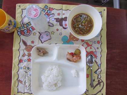 本日の給食の献立をご紹介します。本日の献立は、ご飯、鶏肉のバジル焼き、カレースープ、夏野菜とベーコンのソテー、牛乳でした。
