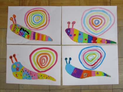 まず、パスでかたつむりの体を描きました。パスで、思い思いに塗りこんでいきます。その後、絵の具で殻を描きました。初めに、殻の一番外側になる部分を描き、次々に内側へと進んでいきました。