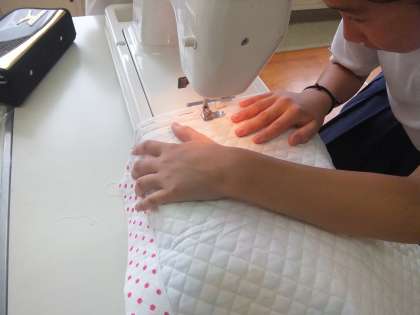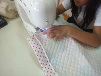 家庭科では、ミシンを使ってナップザックを作っています。出来上がったナップザックを林間学習にもっていこう、と子どもたちは頑張っています。