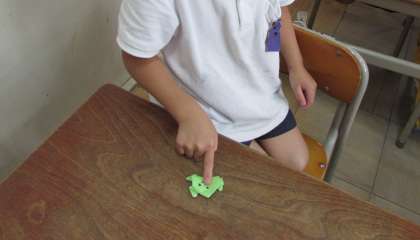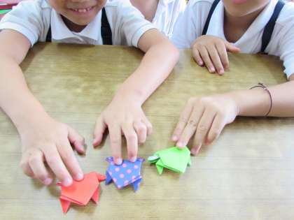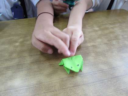 2年生の子どもたちが、折り紙で遊んでいます。今日、作ったのは「ぴょんぴょんガエル」です。作ったカエルのおしりのところを押さえて、手を離すと、ぴょん!とカエルが跳ねました。