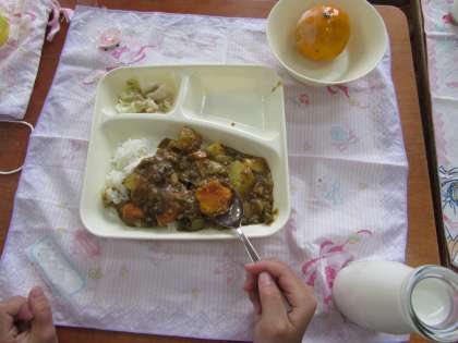 本日の給食の献立をご紹介します。本日の献立は、牛挽肉と夏野菜のカレーライス、ツナとキャベツのマヨネーズ炒め、冷凍みかん、牛乳です。