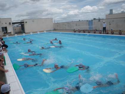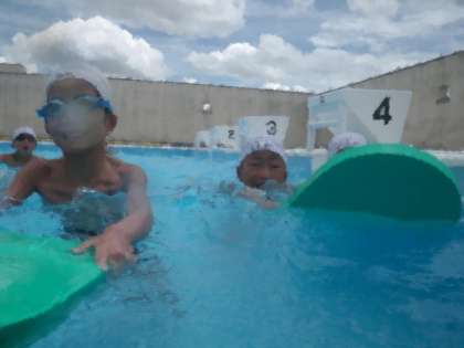 3時間目に入った2年生は、「イルカジャンプ」「潜水艦」の後、ビート板を使ってバタ足の練習をしました。今日は水温も高く、子どもたちは気持ちよく水泳を楽しむことができました。