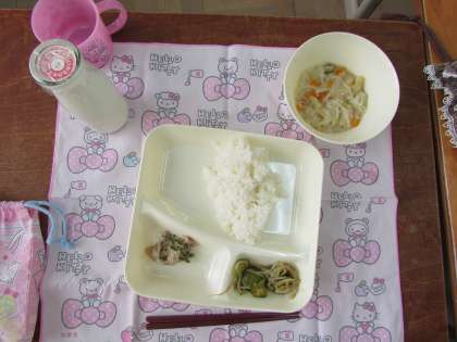 本日の給食の献立をご紹介します。本日の献立は、ご飯、豚肉とピーマンの生姜焼き、にゅう麺、もやしときゅうりのおひたし、牛乳でした。