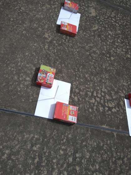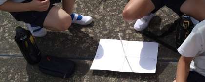 屋上に午前10時、正午、午後2時の3回上がって、ストローのかげの向きと太陽の位置を調べきろくしました。