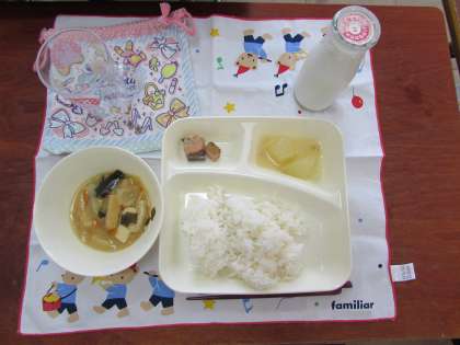 本日の給食の献立をご紹介します。本日の献立は、ご飯、鮭のつけ焼き、みそ汁、冬瓜の煮物、牛乳でした。