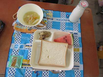 本日の給食の献立をご紹介します。本日の献立は、食パン、りんごジャム、豚肉のカレー風味焼き、じゃがいものスープ、すいか、牛乳でした。