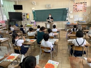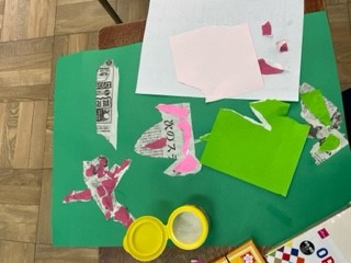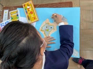 図画工作科の時間に、新聞紙を破いて何に見えるか考えて、作品作りをしました。