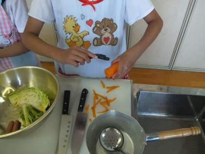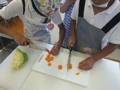 家で料理などの経験がある児童は手際よく作業を行ったり、初めての経験の児童にやさしく声をかけてあげたりするなど、みんな楽しそうに取り組んでいました。