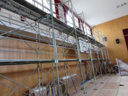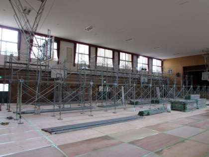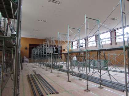 千本小学校の体育館では、現在、天井を取り外す工事を行っています。今日見てみますと、足場が組み立てられていました。工事は9月15日まで続きます。