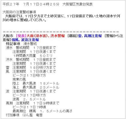 引き続き、大阪市には大雨・洪水警報や、強風注意報が発令されています。登校時、くれぐれもご注意ください。