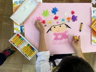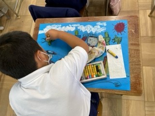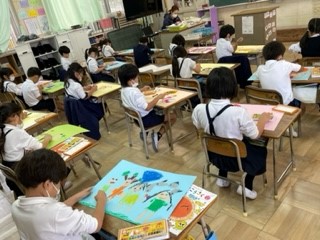 図画工作科の時間に、「ミリーのすてきな帽子」の読み聞かせをきいて、自分たちの帽子からはどんな世界が広がっているのかを想像して、絵を描きました。