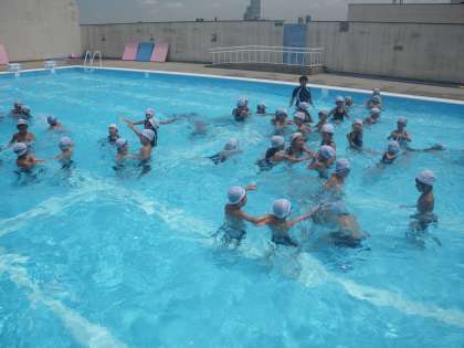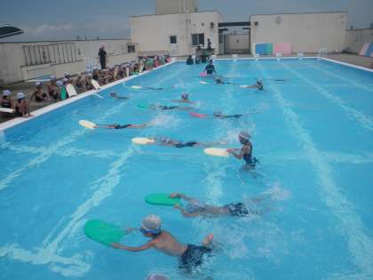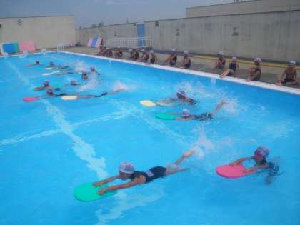 3時間目は、1・2年生です。1・2年生は、「くらげ」や「だるま」をして浮かんだり、集まった人数で手をつなぎ、浮いたり、沈んだりして楽しみました。みんなで「洗濯機」をすると、大きな渦ができておもしろかったです。ビート板を使って、ばた足の練習もしました。