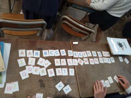 ディロン先生とアルファベットの発音の練習をし、そのあとカードならべをしました。