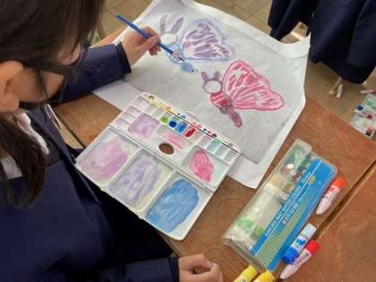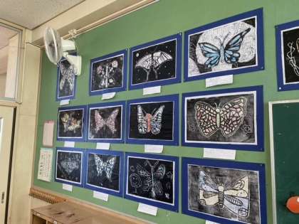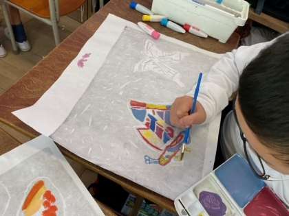 羽の部分に絵の具で色をぬってきれいな作品に仕上げました。
