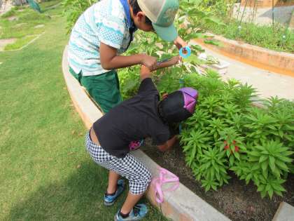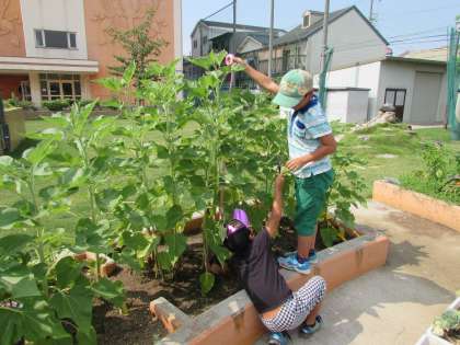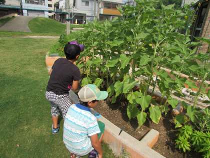 3年生は、学習園でヒマワリやホウセンカを育てています。それらがどれぐらい伸びているのか、3年生の子どもたちが毎週、測っています。