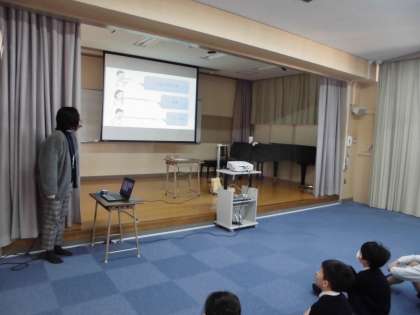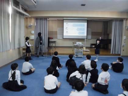 保健指導で、咳やくしゃみでどれくらい飛沫がとぶのか実際にテープを使って説明してもらいました。発育測定では、身長が伸びていたのがとてもうれしかったようです。