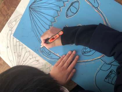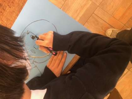 版画板に描いた自分の顔を、彫刻刀で丁寧に彫り進めています。