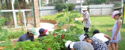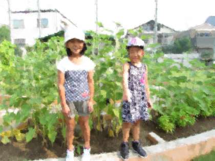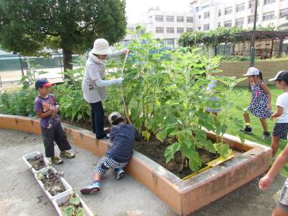 夏の太陽の光を浴びて、ヒマワリはぐんぐん伸び、子どもたちの背をはるかに超えています。つぼみをのぞいてみると、中心の黒い部分が見えていました。もうまもなく、花が咲くことでしょう。