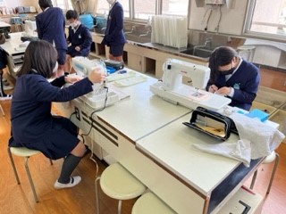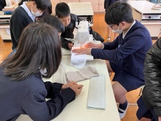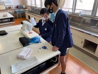 家庭科の授業でミシンを使ってぞうきんを作っています。