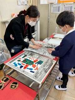 水につけた紙を作品にのせて、新聞ではさんでこすると、きれいな色が出ました。