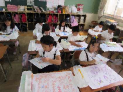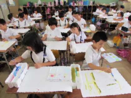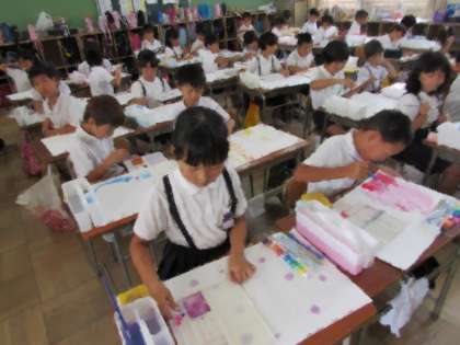 2年生の学習の様子をご紹介します。2年生が図画工作「ふしぎなたまご」に取り組んでいます。大きな大きな卵を、絵の具で丁寧に彩色しています。