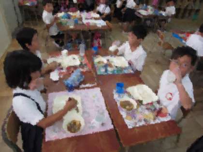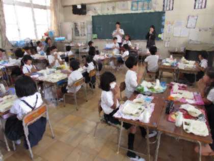 本日より給食が始まりました。本日の献立をご紹介します。本日は、ご飯、肉じゃが、焼きナスの味噌だれがけ、オクラのおかか炒め、牛乳でした。