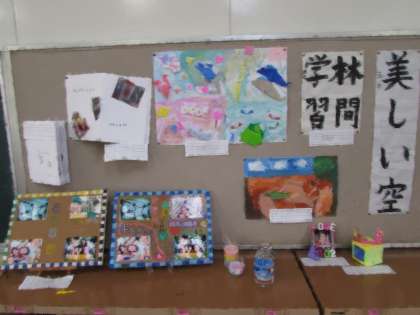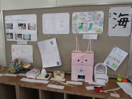 5年生の自由研究では、工作や絵画など、丁寧に取り組んだ作品が並んでいます。