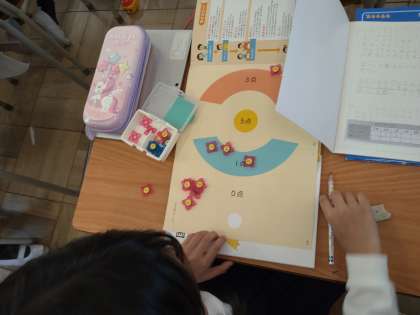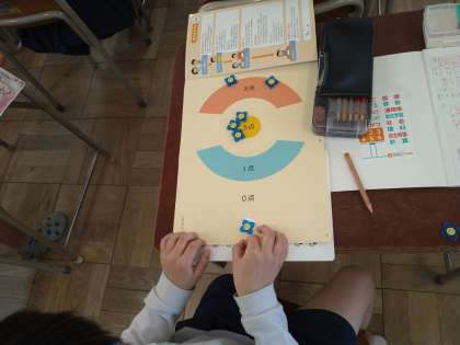 おはじきゲームをして、得点の求め方を考えました。