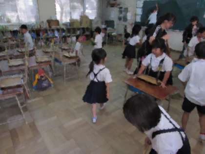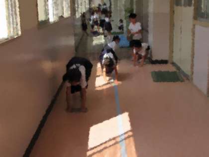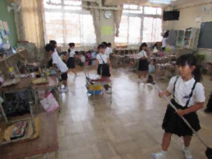 給食が終わって、全校でそうじを行います。教室や廊下、トイレ、特別教室や階段など、それぞれの分担場所を、ていねいに掃除しています。