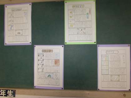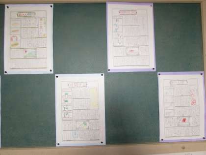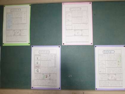 5年生の掲示板に、林間学習の思い出新聞が掲示されています。楽しかった林間学習、1枚の新聞には書ききれないぐらいのたくさんの思い出の中から、子どもたちは出来事を選んで書きました。