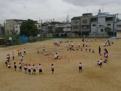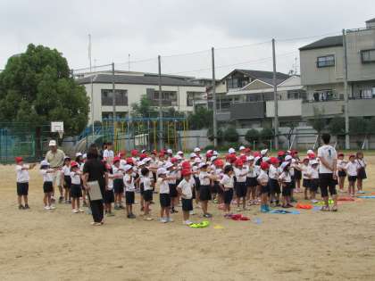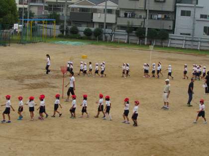 1年生の体育の様子をご紹介します。1年生が運動会で行う玉入れの練習をしました。並び方、行進、待機の仕方など、しっかりと練習をしています。