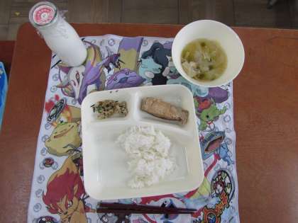 本日の給食の献立をご紹介します。本日の献立は、ご飯、鮭の照り焼き、五目汁、高野豆腐の煎り煮、牛乳でした。