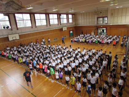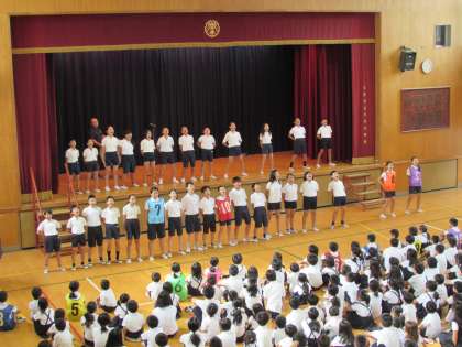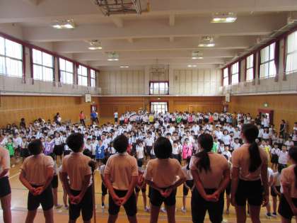 木曜日の朝、児童集会の様子をご紹介します。今日は運動会に向けて、校歌と応援歌「ゴーゴーゴー」を歌いました。初めに、応援団の6年生が、皆の前で歌い方のお手本を示しました。全校児童の元気いっぱいの歌声が、講堂に響き渡りました。