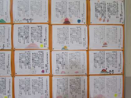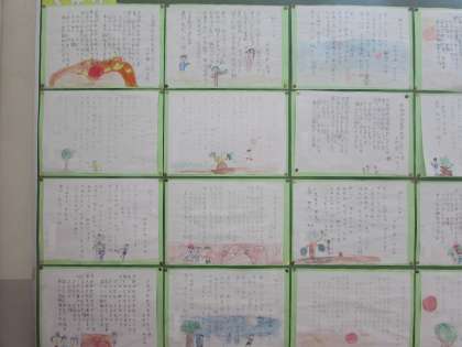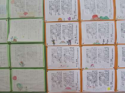 3年生の硬筆書写の作品です。「夕日がせなかをおしてくる」や「紙ひこうき」を、ていねいに視写しました。