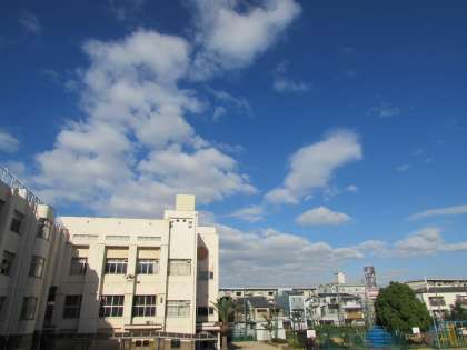 今日の朝、千本小学校から見える空です。青空に白い雲が浮かんでいます。