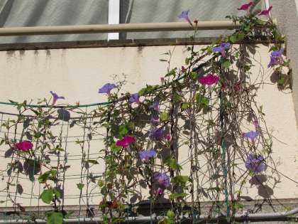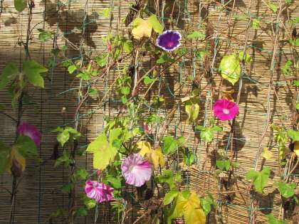 1年生が育てているアサガオが、秋の涼しい風に吹かれて、花を咲かせています。