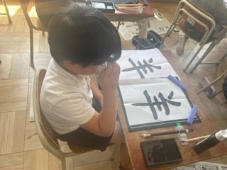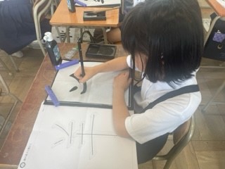 毛筆の学習をしています。書いているのは漢字の「羊」です。