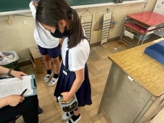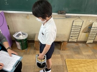 握力の測定をしています。指の先が少し引っかかるぐらいの幅に合わせると握りやすいです。昨年より記録は伸びたかな?