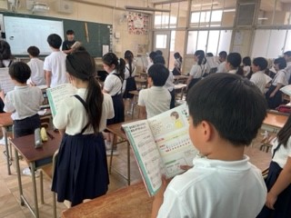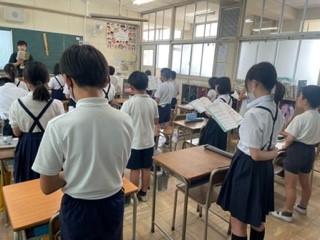 みんなで合唱をしています。高音のところが美しく響いています。とっても上手ですよ。