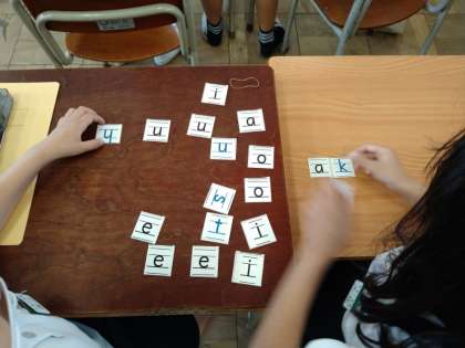 そのあとは、先生が言った言葉をローマ字カードで並べる活動をしました。