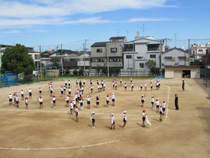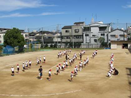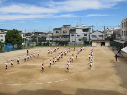 4年生の練習の様子です。4年生が、団体演技の練習に取り組んでいます。場所移動も、ばっちりとできています。
